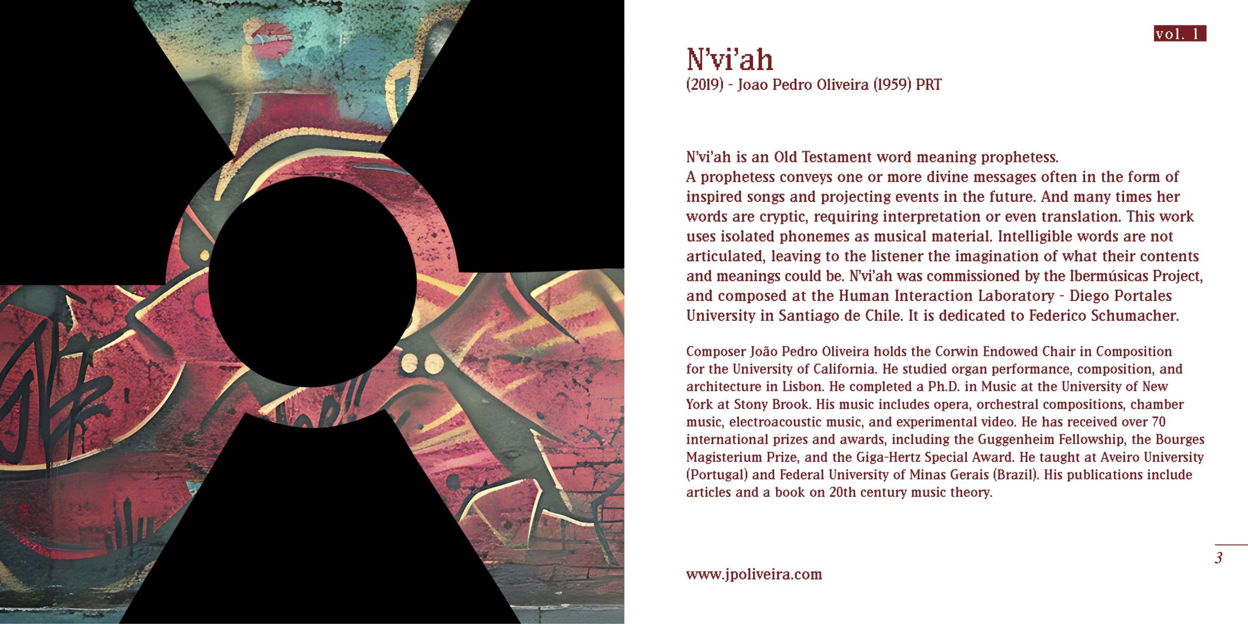 A prophetess conveys one or more divine messages often in the form of inspired songs and projecting events in the future. And many times her words are cryptic, requiring interpretation or even translation. This work uses isolated phonemes as musical material. Intelligible words are not articulated, leaving to the listener the imagination of what their contents and meanings could be. N’vi’ah was commissioned by the Ibermúsicas Project, and composed at the Human Interaction Laboratory – Diego Portales University in Santiago de Chile. It is dedicated to Federico Schumacher.