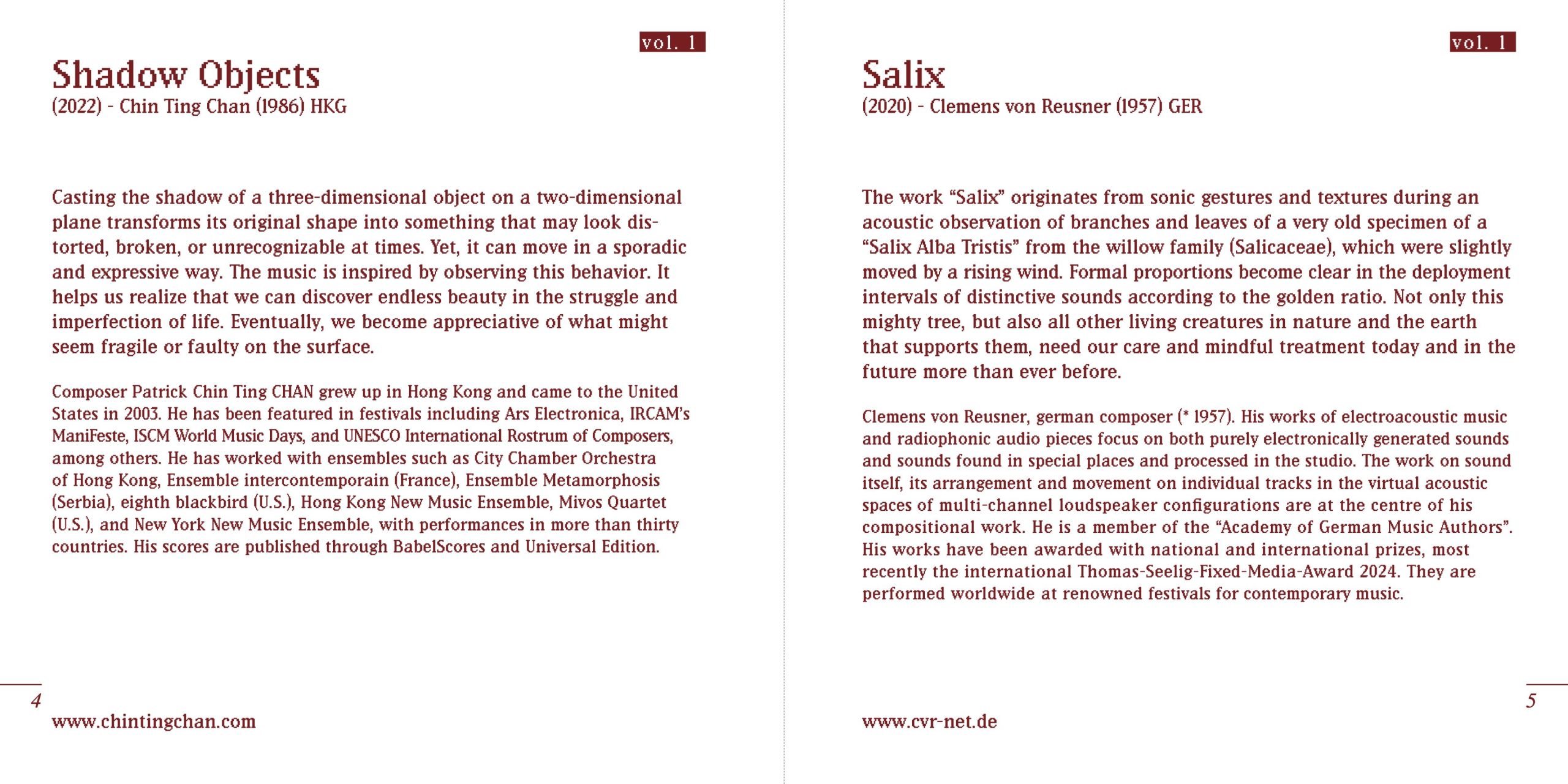 The work “Salix” originates from sonic gestures and textures during an acoustic observation of branches and leaves of a very old specimen of a “Salix Alba Tristis” from the willow family (Salicaceae), which were slightly moved by a rising wind. Formal proportions become clear in the deployment intervals of distinctive sounds according to the golden ratio. Not only this mighty tree, but also all other living creatures in nature and the earth that supports them, need our care and mindful treatment today and in the future more than ever before.
