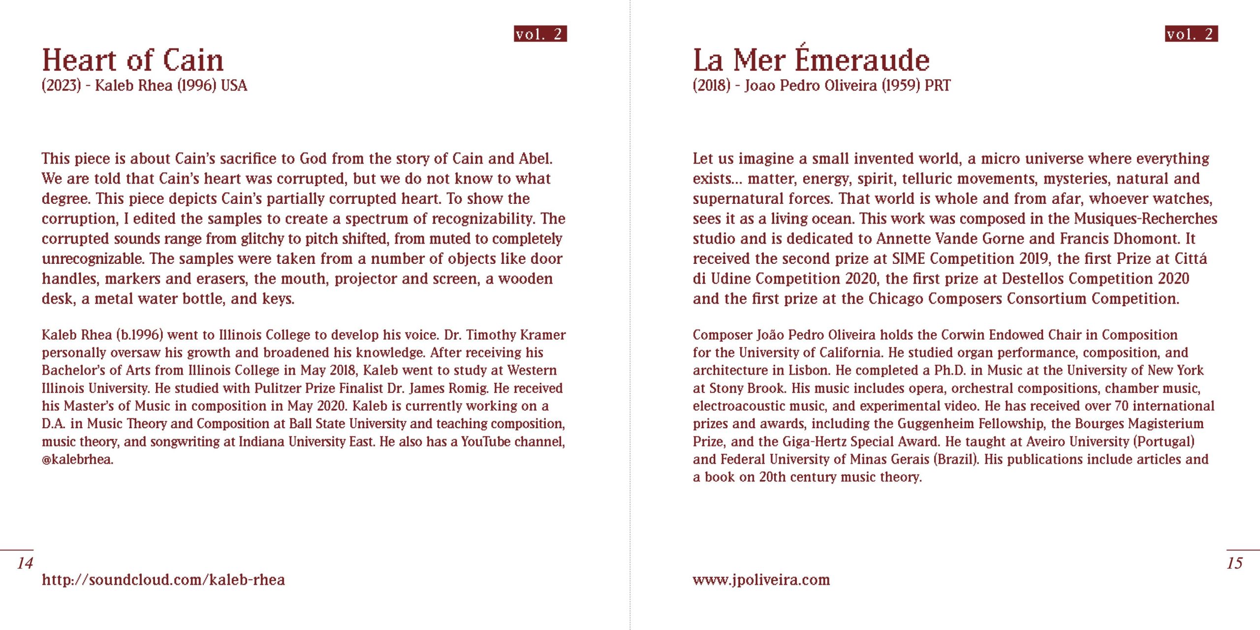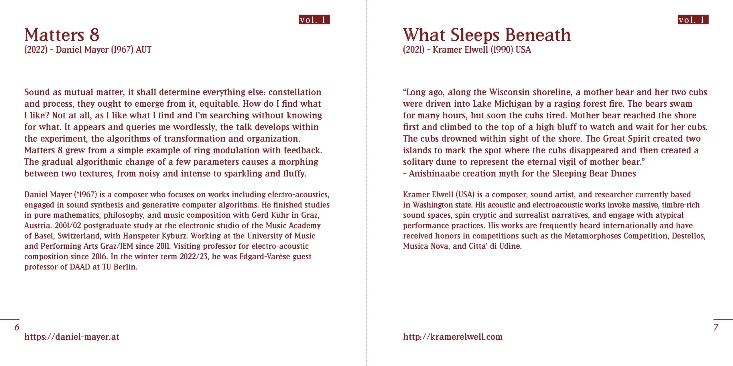 Kramer Elwell (USA) is a composer, sound artist, and researcher currently based in Washington state. His acoustic and electroacoustic works invoke massive, timbre-rich sound spaces, spin cryptic and surrealist narratives, and engage with atypical performance practices. His works are frequently heard internationally and have received honors in competitions such as the Metamorphoses Competition, Destellos, Musica Nova, and Citta’ di Udine. http://kramerelwell.com