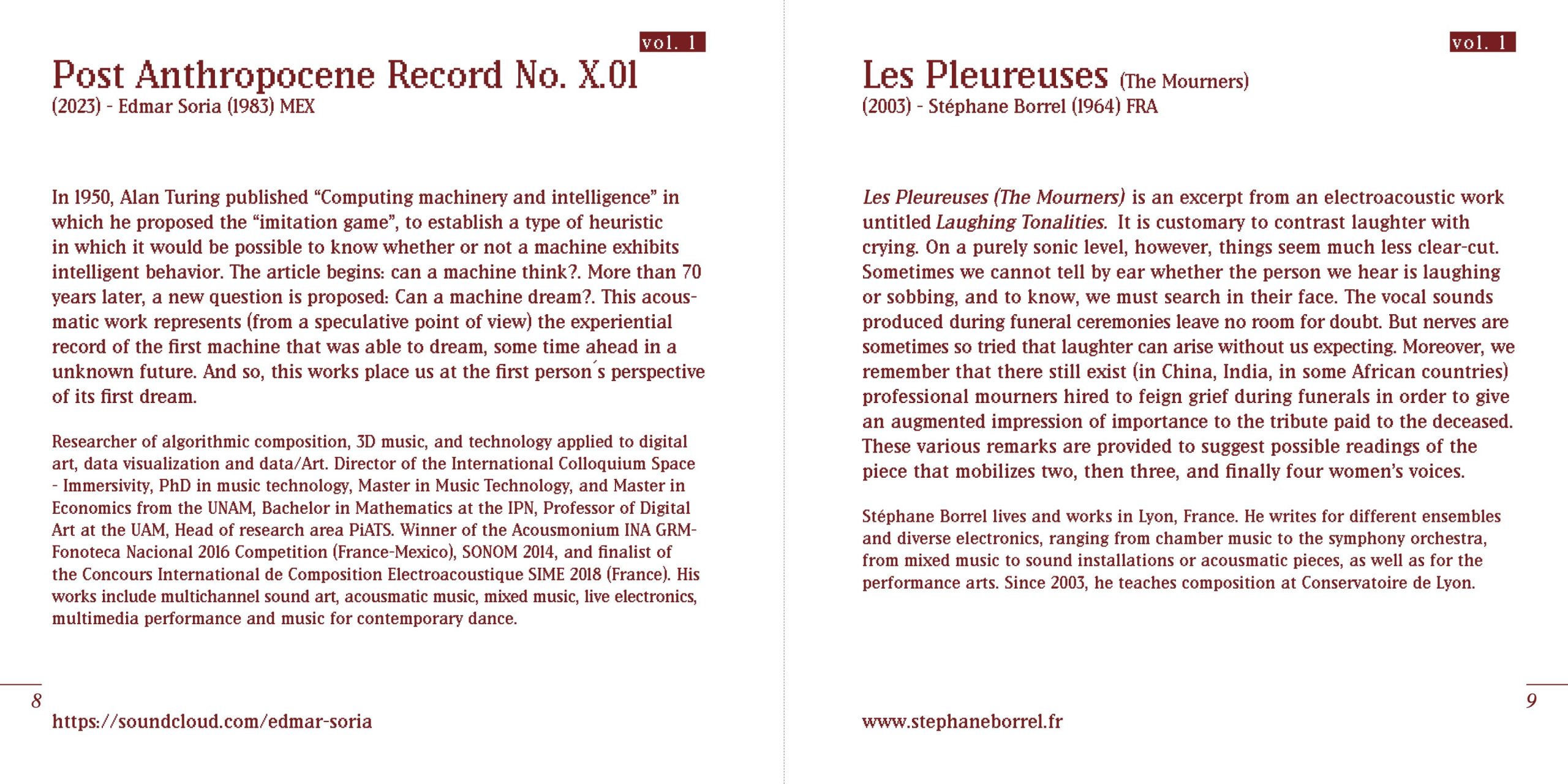 Les Pleureuses (The Mourners) is an excerpt from an electroacoustic work untitled Laughing Tonalities. It is customary to contrast laughter with crying. On a purely sonic level, however, things seem much less clear-cut. Sometimes we cannot tell by ear whether the person we hear is laughing or sobbing, and to know, we must search in their face. The vocal sounds produced during funeral ceremonies leave no room for doubt. But nerves are sometimes so tried that laughter can arise without us expecting. Moreover, we remember that there still exist (in China, India, in some African countries) professional mourners hired to feign grief during funerals in order to give an augmented impression of importance to the tribute paid to the deceased. These various remarks are provided to suggest possible readings of the piece that mobilizes two, then three, and finally four women’s voices.
