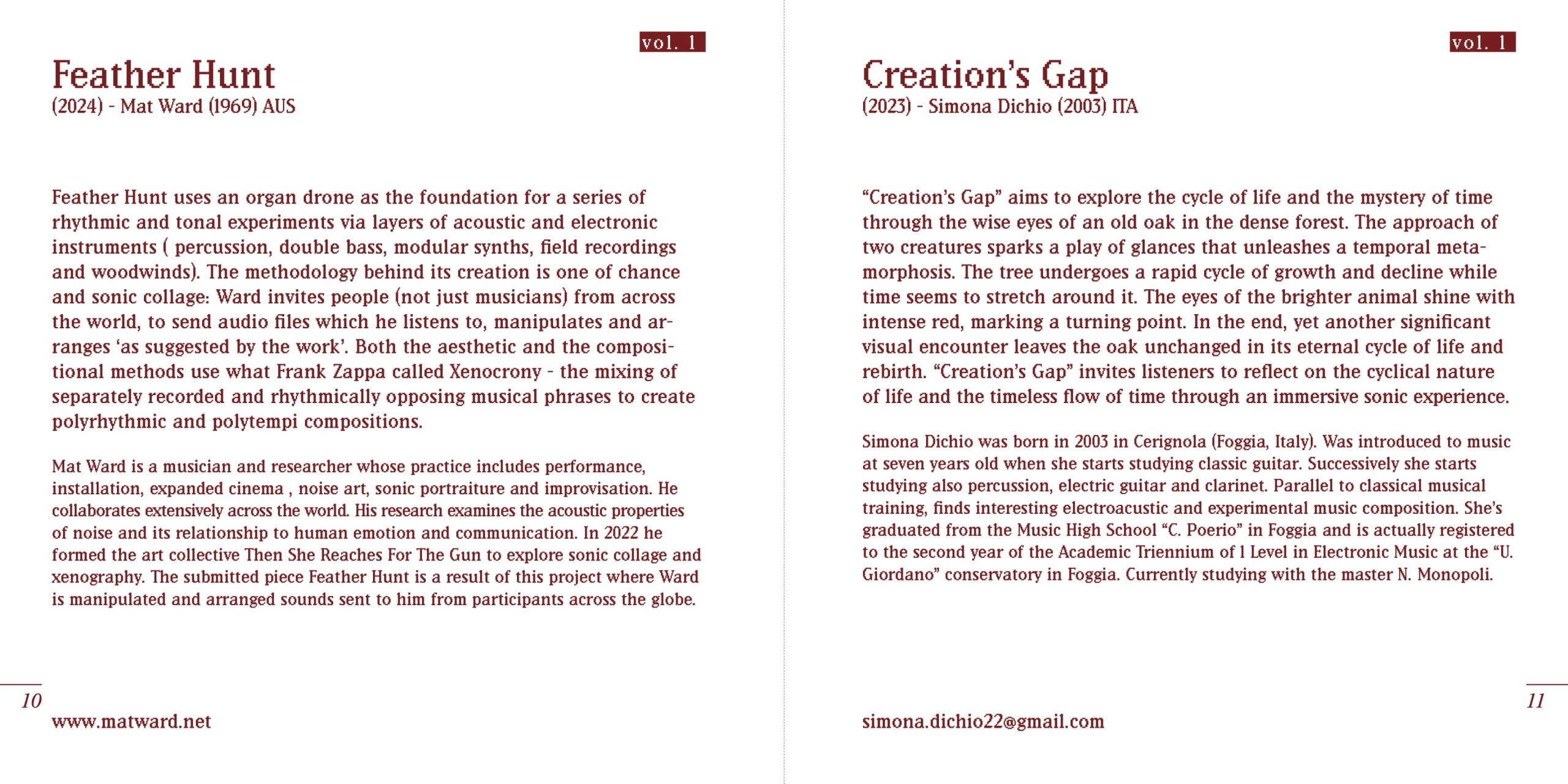 Mat Ward is a musician and researcher whose practice includes performance, installation, expanded cinema , noise art, sonic portraiture and improvisation. He collaborates extensively across the world. His research examines the acoustic properties of noise and its relationship to human emotion and communication. In 2022 he formed the art collective Then She Reaches For The Gun to explore sonic collage and xenography. The submitted piece Feather Hunt is a result of this project where Ward is manipulated and arranged sounds sent to him from participants across the globe. www.matward.net