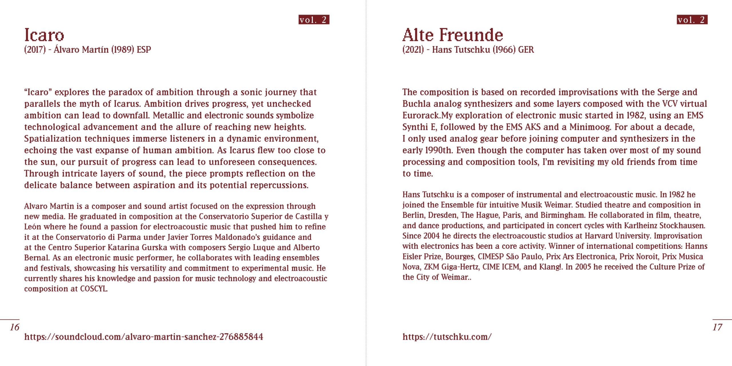 “Icaro” explores the paradox of ambition through a sonic journey that parallels the myth of Icarus. Ambition drives progress, yet unchecked ambition can lead to downfall. Metallic and electronic sounds symbolize technological advancement and the allure of reaching new heights. Spatialization techniques immerse listeners in a dynamic environment, echoing the vast expanse of human ambition. As Icarus flew too close to the sun, our pursuit of progress can lead to unforeseen consequences. Through intricate layers of sound, the piece prompts reflection on the delicate balance between aspiration and its potential repercussions.
