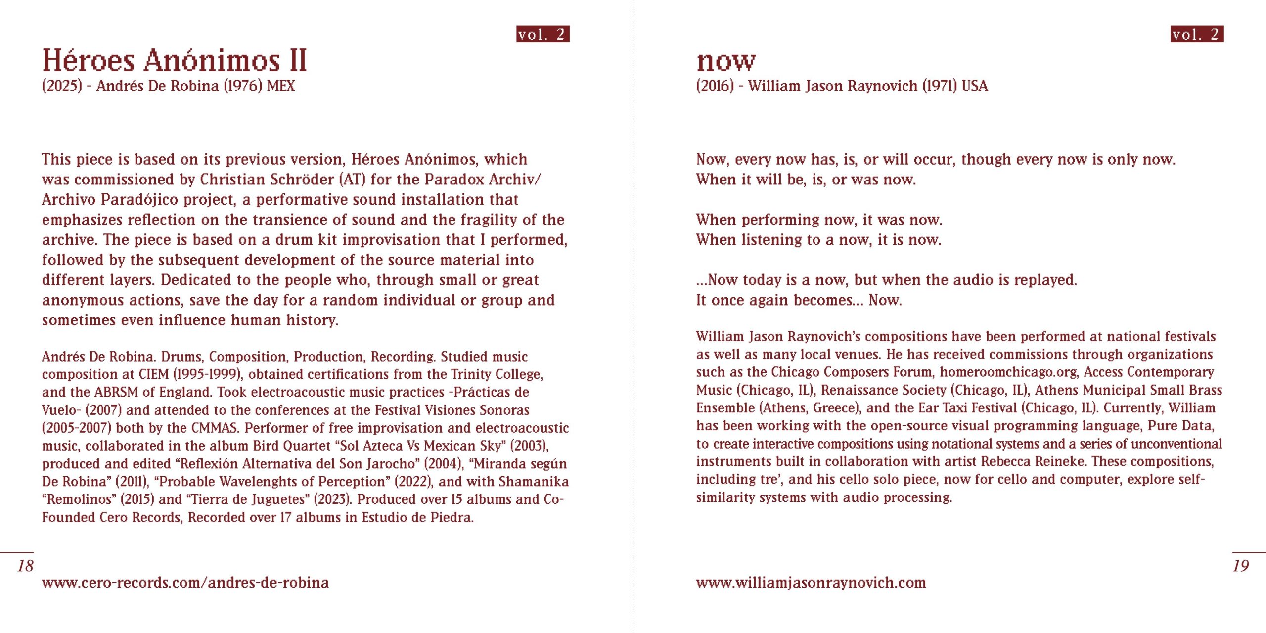 Andrés De Robina. Drums, Composition, Production, Recording. Studied music composition at CIEM (1995-1999), obtained certifications from the Trinity College, and the ABRSM of England. Took electroacoustic music practices -Prácticas de Vuelo- (2007) and attended to the conferences at the Festival Visiones Sonoras (2005-2007) both by the CMMAS. Performer of free improvisation and electroacoustic music, collaborated in the album Bird Quartet “Sol Azteca Vs Mexican Sky” (2003), produced and edited “Reflexión Alternativa del Son Jarocho” (2004), “Miranda según De Robina” (2011), “Probable Wavelenghts of Perception” (2022), and with Shamanika “Remolinos” (2015) and “Tierra de Juguetes” (2023). Produced over 15 albums and Co-Founded Cero Records, Recorded over 17 albums in Estudio de Piedra. www.cero-records.com/andres-de-robina