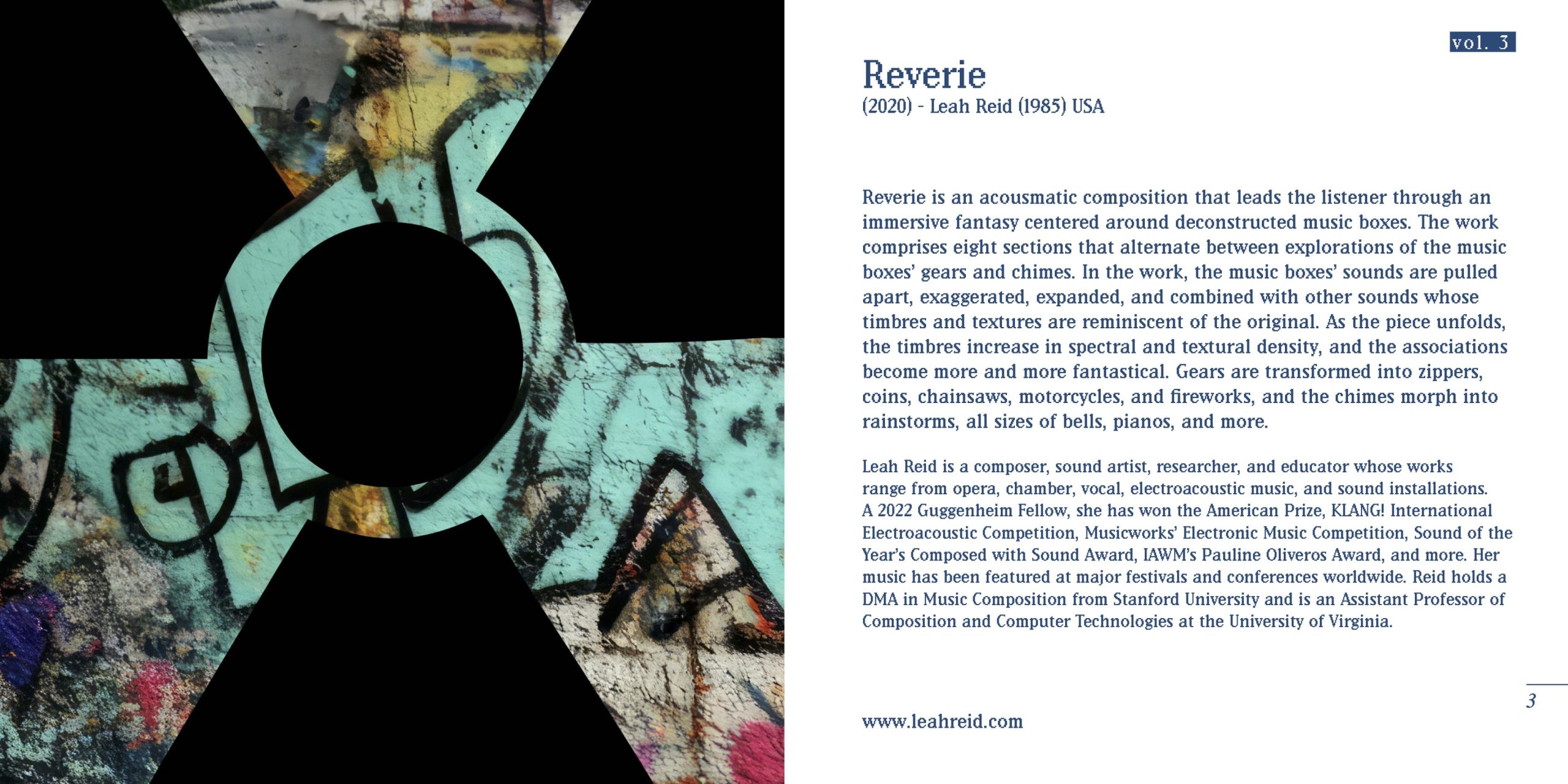 Reverie is an acousmatic composition that leads the listener through an immersive fantasy centered around deconstructed music boxes. The work comprises eight sections that alternate between explorations of the music boxes’ gears and chimes. In the work, the music boxes’ sounds are pulled apart, exaggerated, expanded, and combined with other sounds whose timbres and textures are reminiscent of the original. As the piece unfolds, the timbres increase in spectral and textural density, and the associations become more and more fantastical. Gears are transformed into zippers, coins, chainsaws, motorcycles, and fireworks, and the chimes morph into rainstorms, all sizes of bells, pianos, and more.