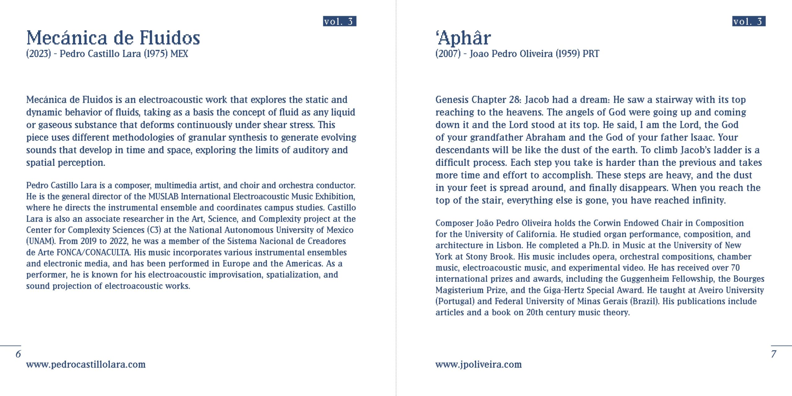 Pedro Castillo Lara is a composer, multimedia artist, and choir and orchestra conductor. He is the general director of the MUSLAB International Electroacoustic Music Exhibition, where he directs the instrumental ensemble and coordinates campus studies. Castillo Lara is also an associate researcher in the Art, Science, and Complexity project at the Center for Complexity Sciences (C3) at the National Autonomous University of Mexico (UNAM). From 2019 to 2022, he was a member of the Sistema Nacional de Creadores de Arte FONCA/CONACULTA. His music incorporates various instrumental ensembles and electronic media, and has been performed in Europe and the Americas. As a performer, he is known for his electroacoustic improvisation, spatialization, and sound projection of electroacoustic works. www.pedrocastillolara.com