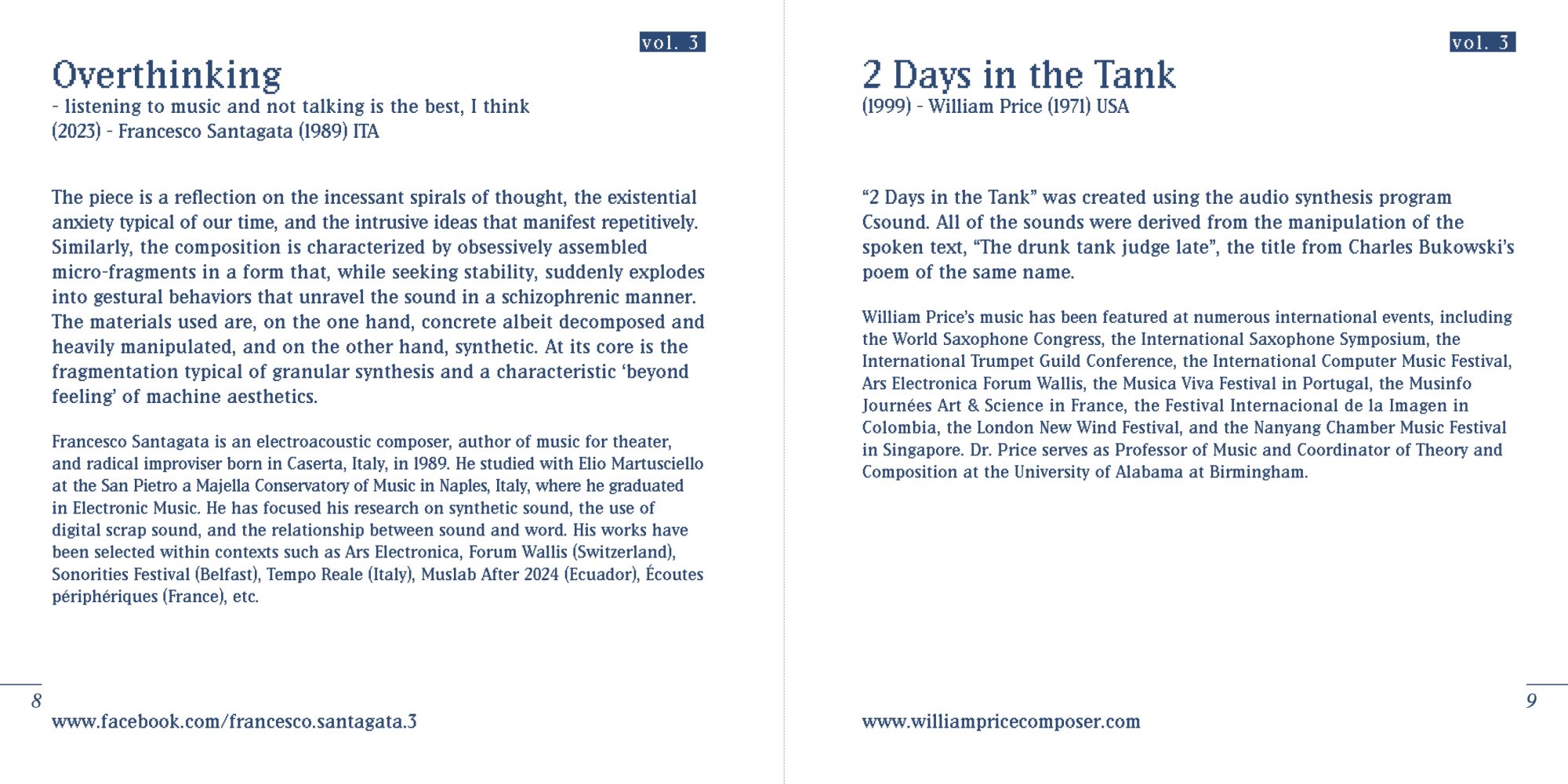 William Price’s music has been featured at numerous international events, including the World Saxophone Congress, the International Saxophone Symposium, the International Trumpet Guild Conference, the International Computer Music Festival, Ars Electronica Forum Wallis, the Musica Viva Festival in Portugal, the Musinfo Journées Art & Science in France, the Festival Internacional de la Imagen in Colombia, the London New Wind Festival, and the Nanyang Chamber Music Festival in Singapore. Dr. Price serves as Professor of Music and Coordinator of Theory and Composition at the University of Alabama at Birmingham. www.williampricecomposer.com