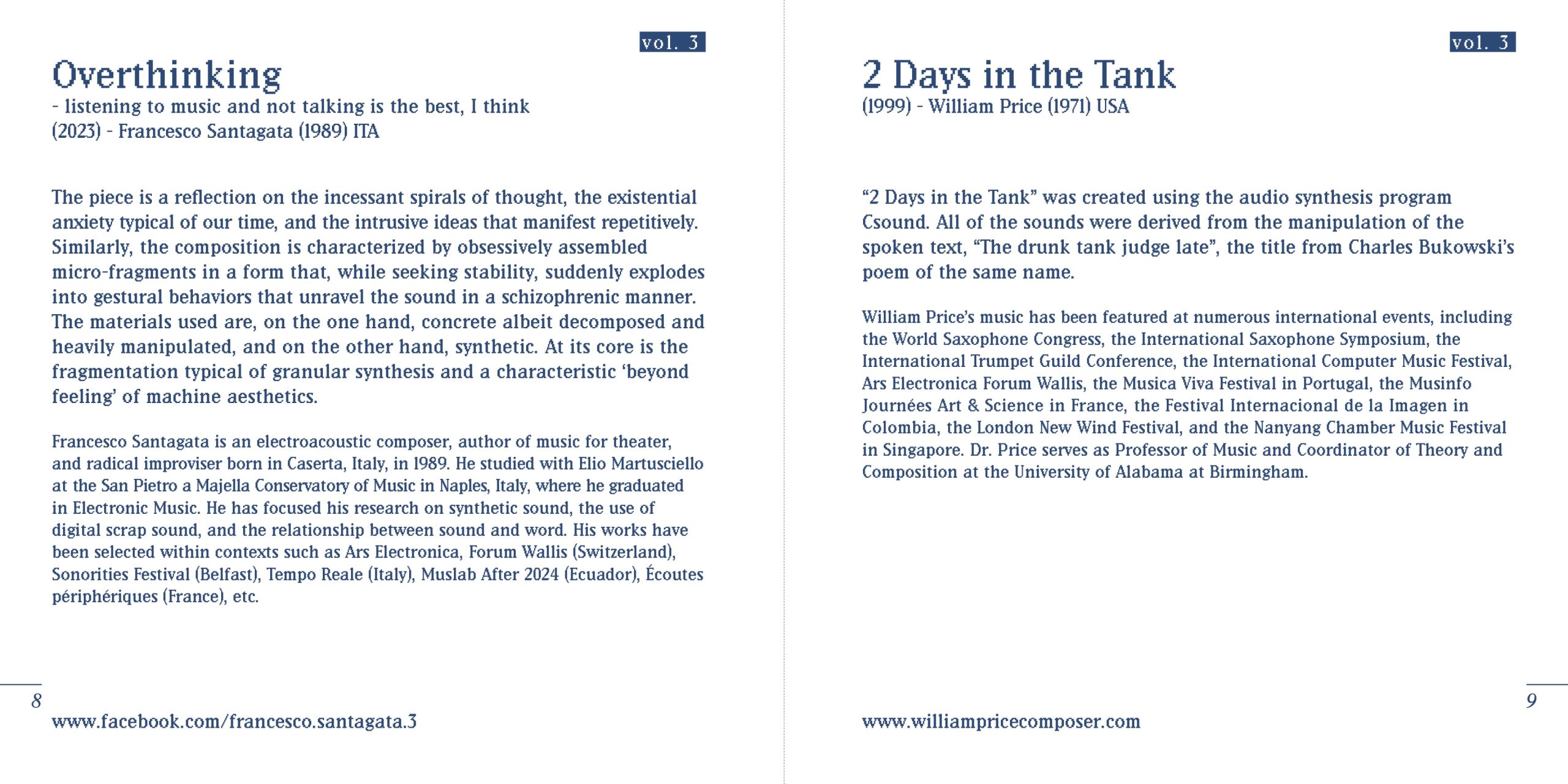 “2 Days in the Tank” was created using the audio synthesis program Csound. All of the sounds were derived from the manipulation of the spoken text, “The drunk tank judge late”, the title from Charles Bukowski’s poem of the same name.
