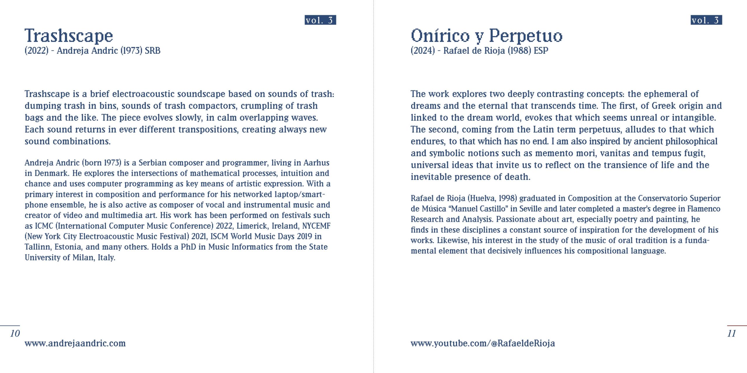 Rafael de Rioja (Huelva, 1998) graduated in Composition at the Conservatorio Superior de Música “Manuel Castillo” in Seville and later completed a master’s degree in Flamenco Research and Analysis. Passionate about art, especially poetry and painting, he finds in these disciplines a constant source of inspiration for the development of his works. Likewise, his interest in the study of the music of oral tradition is a fundamental element that decisively influences his compositional language. www.youtube.com/@RafaeldeRioja