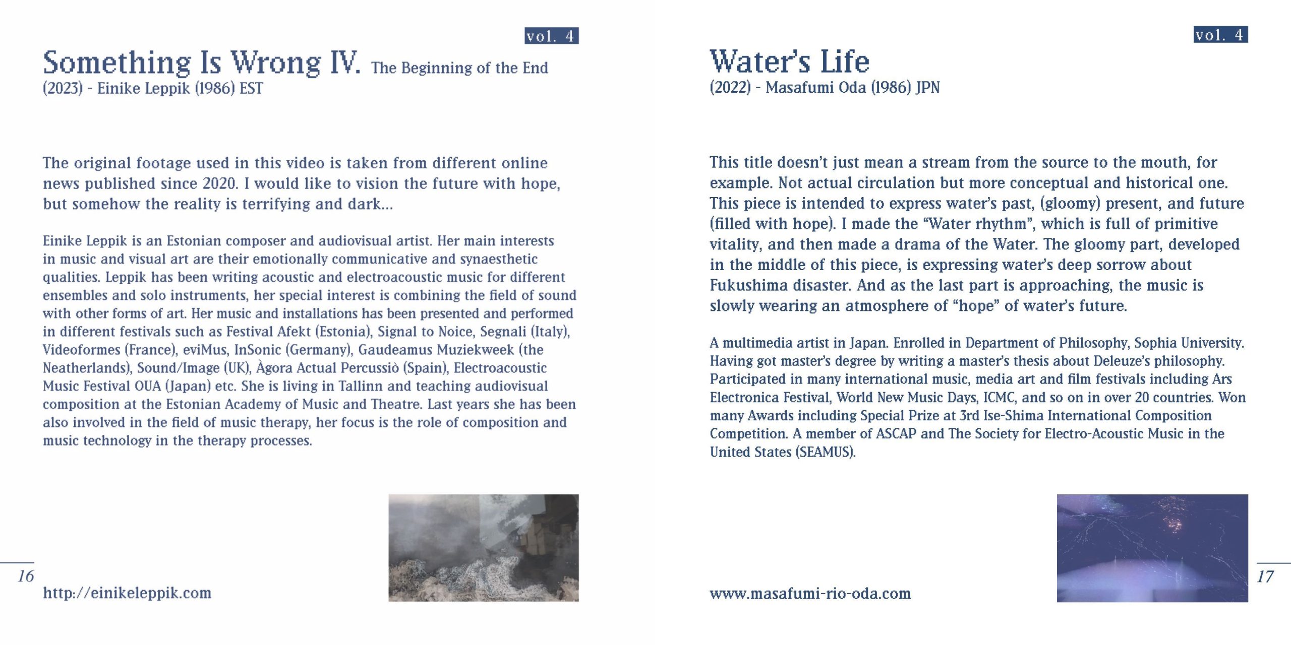 Einike Leppik is an Estonian composer and audiovisual artist. Her main interests in music and visual art are their emotionally communicative and synaesthetic qualities. Leppik has been writing acoustic and electroacoustic music for different ensembles and solo instruments, her special interest is combining the field of sound with other forms of art. Her music and installations has been presented and performed in different festivals such as Festival Afekt (Estonia), Signal to Noice, Segnali (Italy), Videoformes (France), eviMus, InSonic (Germany), Gaudeamus Muziekweek (the Neatherlands), Sound/Image (UK), Àgora Actual Percussiò (Spain), Electroacoustic Music Festival OUA (Japan) etc.