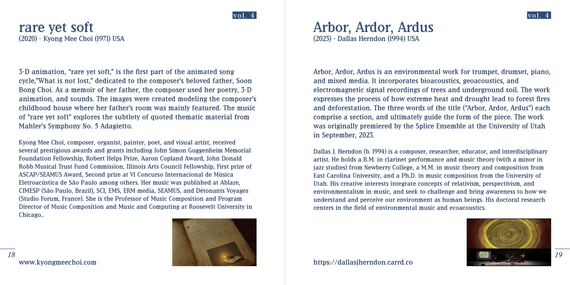 Dallas J. Herndon (b. 1994) is a composer, researcher, educator, and interdisciplinary artist. He holds a B.M. in clarinet performance and music theory (with a minor in jazz studies) from Newberry College, a M.M. in music theory and composition from East Carolina University, and a Ph.D. in music composition from the University of Utah. His creative interests integrate concepts of relativism, perspectivism, and environmentalism in music, and seek to challenge and bring awareness to how we understand and perceive our environment as human beings. His doctoral research centers in the field of environmental music and ecoacoustics. https://dallasjherndon.carrd.co