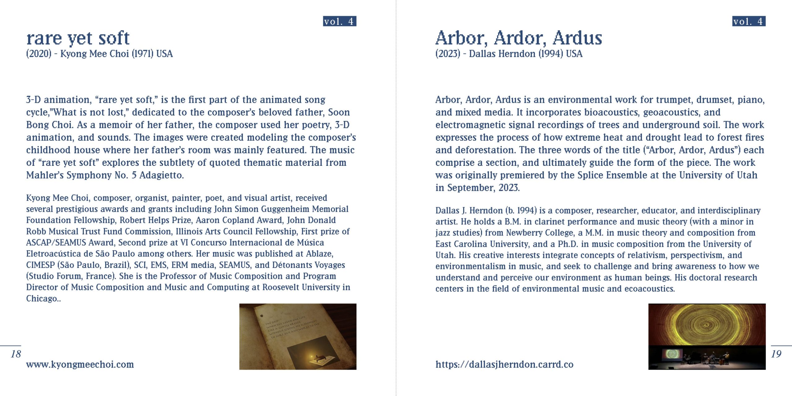 Arbor, Ardor, Ardus is an environmental work for trumpet, drumset, piano, and mixed media. It incorporates bioacoustics, geoacoustics, and electromagnetic signal recordings of trees and underground soil. The work expresses the process of how extreme heat and drought lead to forest fires and deforestation. The three words of the title (“Arbor, Ardor, Ardus”) each comprise a section, and ultimately guide the form of the piece. The work was originally premiered by the Splice Ensemble at the University of Utah in September, 2023.